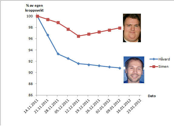 Som vi husker fra forrige episode, så hadde Simen «Kolibriviljen» Gimmestad begynt å kjenne lukta av sixpack på bystranda til sommeren. Og med det som motivasjon hadde han presset seg ned over 2 kilogram på 14 dager i desember. Totalt hadde kraftpakken senka vekta hele 3,5% (3,1 kg). Håvard «Jernviljen» Karlsen hadde på sin side begynt å kjenne smaken av stagnasjon. Etter en drøy start, der han senket vekta 6,2 kg på 14 dager (noe som forøvrig førte til sterke dopingbeskyldninger fra en frustrert Gimmestad), så hadde kurven begynt å flate ut.